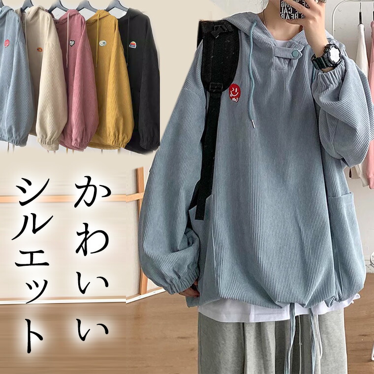 かわいい系男子に 裾しぼってコロンとしたシルエット コーデュロイパーカー ゆったりオーバーサイズ 韓国ファッションフリース パーカー 長袖 プルオーバー メンズ レディース コクーンシルエット ニット