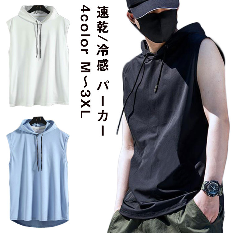 速乾 パーカー 無地 夏パーカー プルオーバーパーカー 袖なし ノースリーブ トップス トレーニング ひんやり ノースリーブパーカー ジム スポーツ フード付き