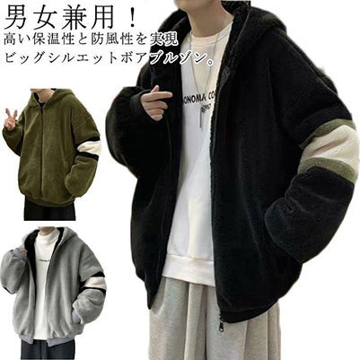 ふわふわ もこもこ ボアジャケット メンズ フード付き 防寒 アウター ボアコート ゆったり ボア 秋 大きいサイズ コート カジュアル ジップアップパーカー 暖かい 配色 おしゃれ ジャケット