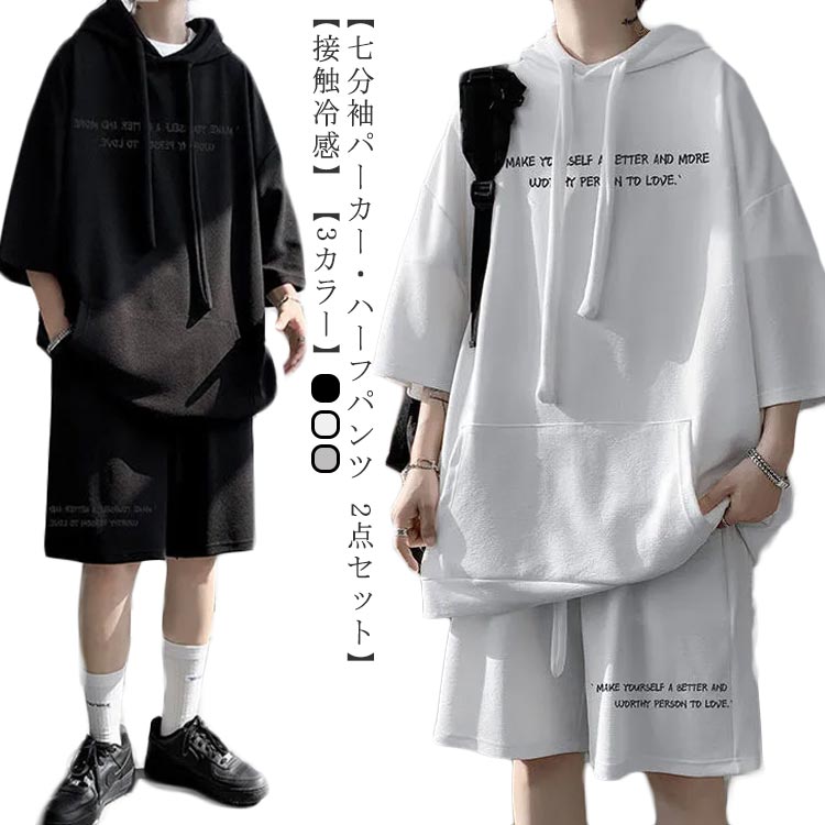 パーカー メンズ 上下 ルームウェア スウェット ハーフパンツ 2点セット 涼しい 接触冷感 ひんやり 夏 七分袖 ショートパンツ 短パン ビッグシルエット 部屋着 ストリート カジュアル