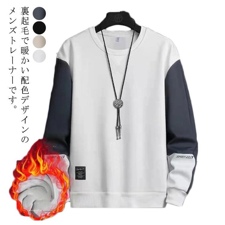 裏起毛 トレーナー メンズ スウェット パーカー 暖かい 秋冬 防寒 裏フリース 厚手 あったかい プルオーバー トップス クルーネック ゆったり 無地 シンプル スポーツ ルームウ 配色