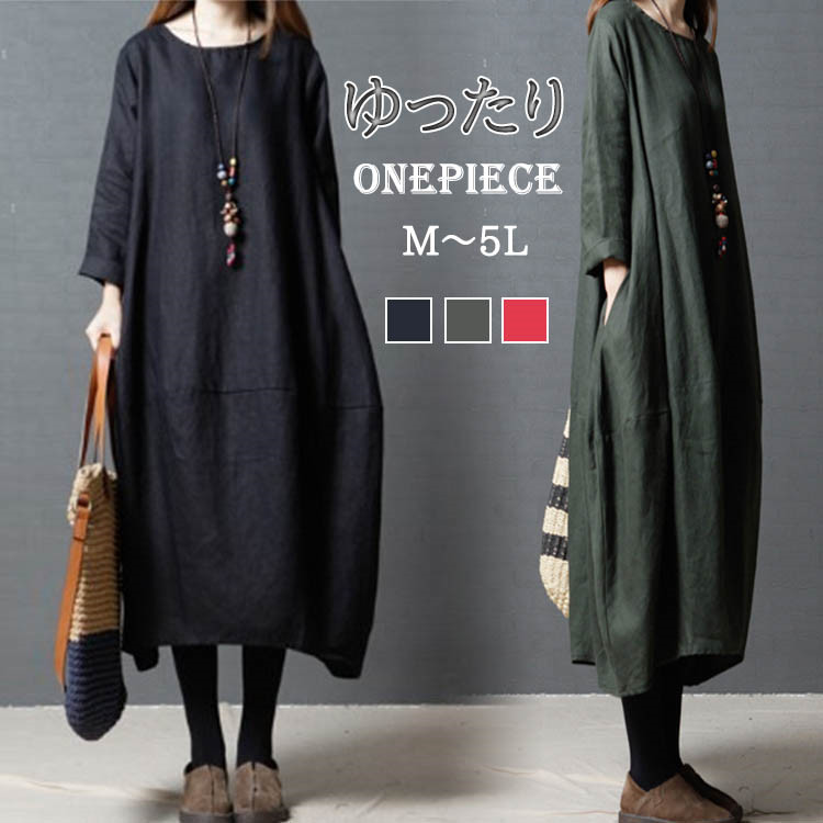ロングワンピース ワンピース 春 長袖 綿麻 無地 レディース ラウンドネック ミモレ丈 体型カバー Aライン ゆったり オシャレ シンプル お出かけ カジュアル 大きいサイズ L-1072 マキシ