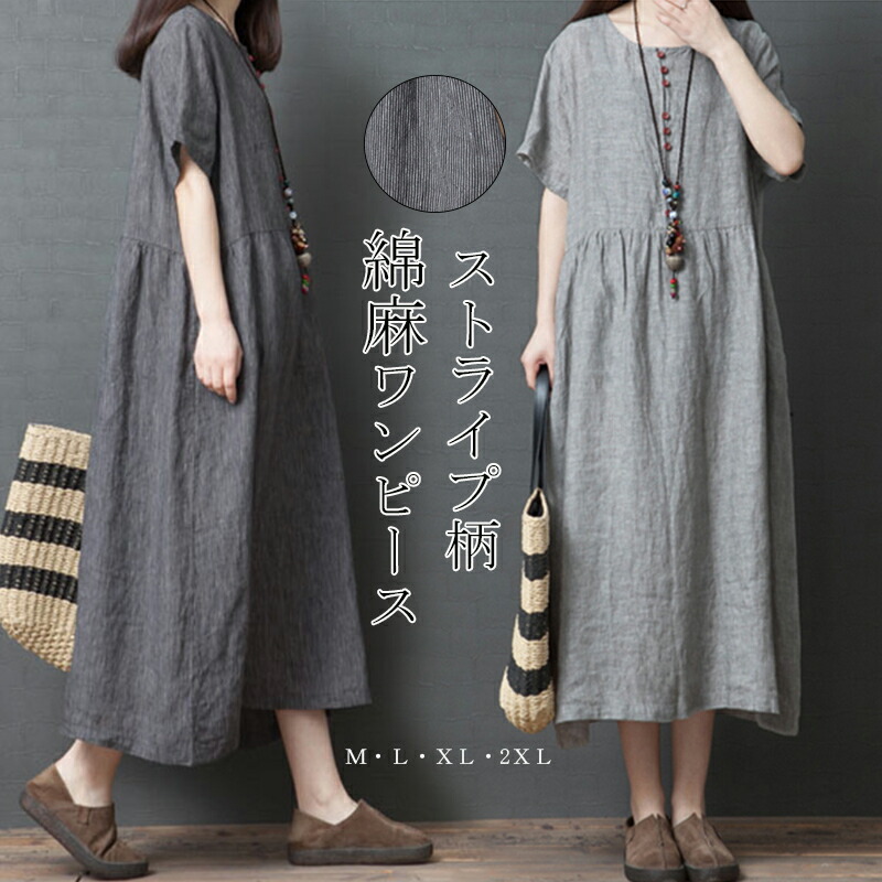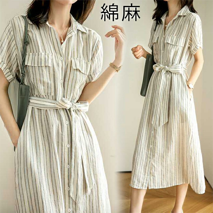 綿麻 半袖 ストライプ柄ワンピース 綿 コットンワンピース ロングワンピース マキシワンピース レディース ロング丈 カジュアル風 ゆったり 体型カバーマキシ丈ワンピース ベルト無地
