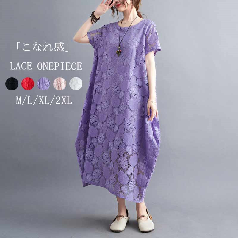 コクーンワンピース 半袖 ワンピース レースワンピース 白 黒 ロングワンピース レディース 総レース 白ワンピース 花柄 半袖ワンピース ロング丈 無地 春 バルーンワンピース シンプル オシャ 夏