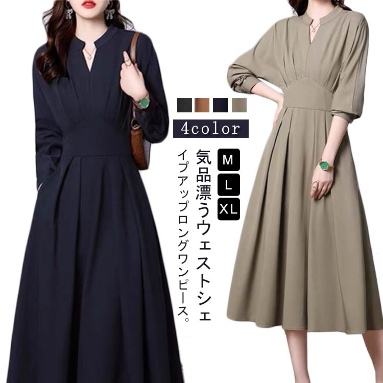 ウェストシェイプアップワンピース 長袖ワンピース Vネック スキッパーカラー ワンピース シャツワンピース レディース ロング丈 Aライン フレアワンピース 着痩せ ドレス 40代 ミモレワンピース
