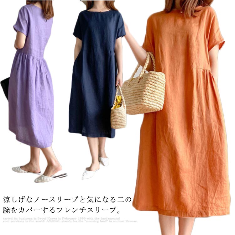 リネンワンピース ロングワンピース ナチュラル 半袖 大人可愛い カジュアル シンプル おしゃれ お出かけ デート 普段使い デイリー 着回し リネン ワンピース キャミソールなし 麻