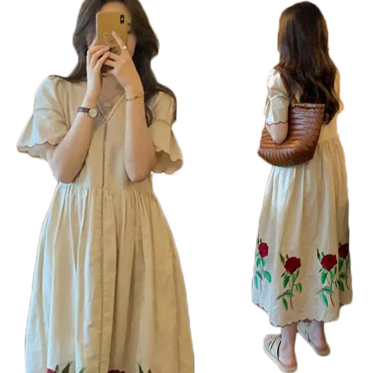 レディース ワンピース リネン 夏物 大きサイズ ゆったり 刺繍 綿麻 ワンピ ロングワンピース Aライン 半袖 フラワー柄 着痩せ フェミニン シンプル カジュアル マタニティーウェア おしゃれ