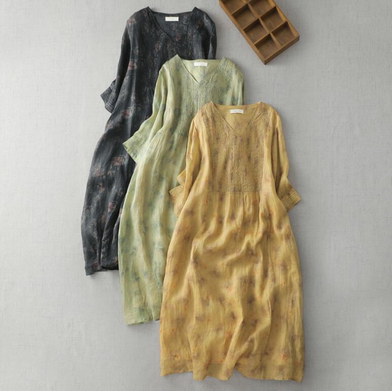 リネンシャツワンピース ロングワンピースワンピース レディースファッション ナチュラル 7分袖 麻ワンピース 無地ワンピース