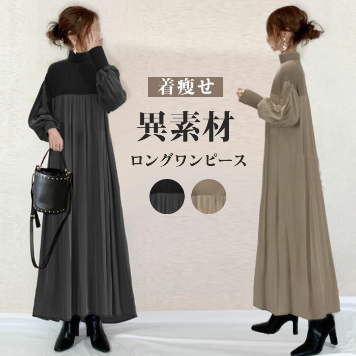 ロングワンピース 長袖 レディース ニット 可愛い 異素材 きれいめ ワンピース ロング丈 マキシ丈 楽ちん 体型カバー リブニット ギャザー ゆったり 無地 カジュアル マキシワンピース シンプル