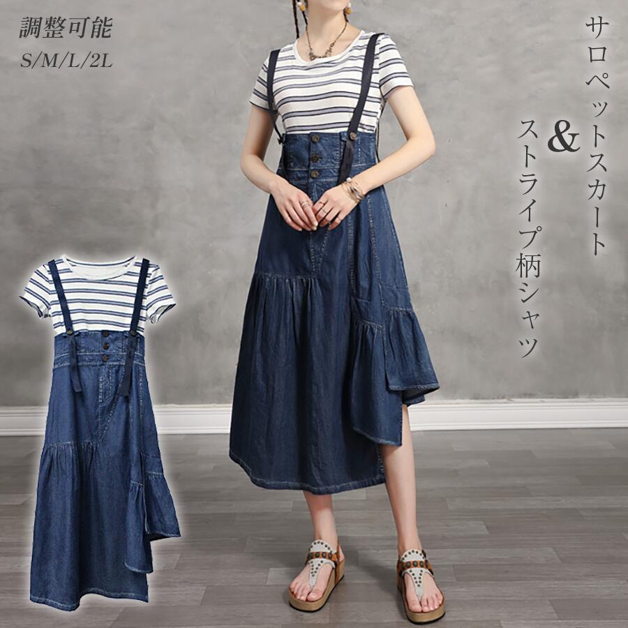 サロペット ワンピース デニム マキシワンピース 上下セット 体型カバー ハイウエスト オールインワン ロング ジャンパースカート マキシワンピ デニムワンピース レイヤード 重ね着 ブラック