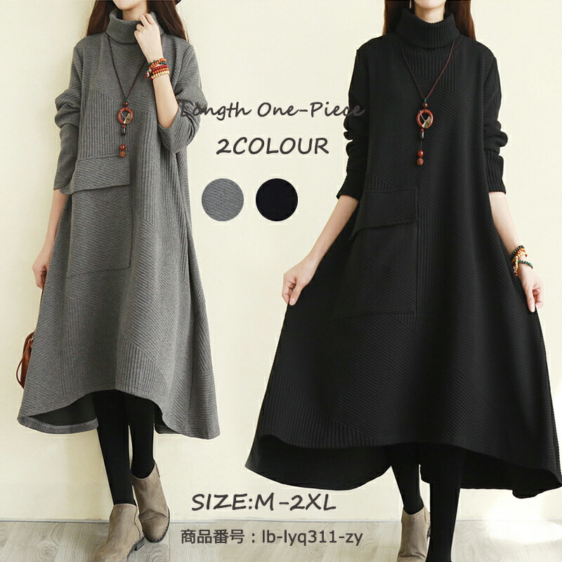 ワンピース レディース 秋冬 ロングワンピース 長袖 チュニック ロングワンピ ミモレ丈 タートルネック 無地 マキシワンピース 大きいサイズ 体型カバー ハイネック Aライン 前後差あり お フレア
