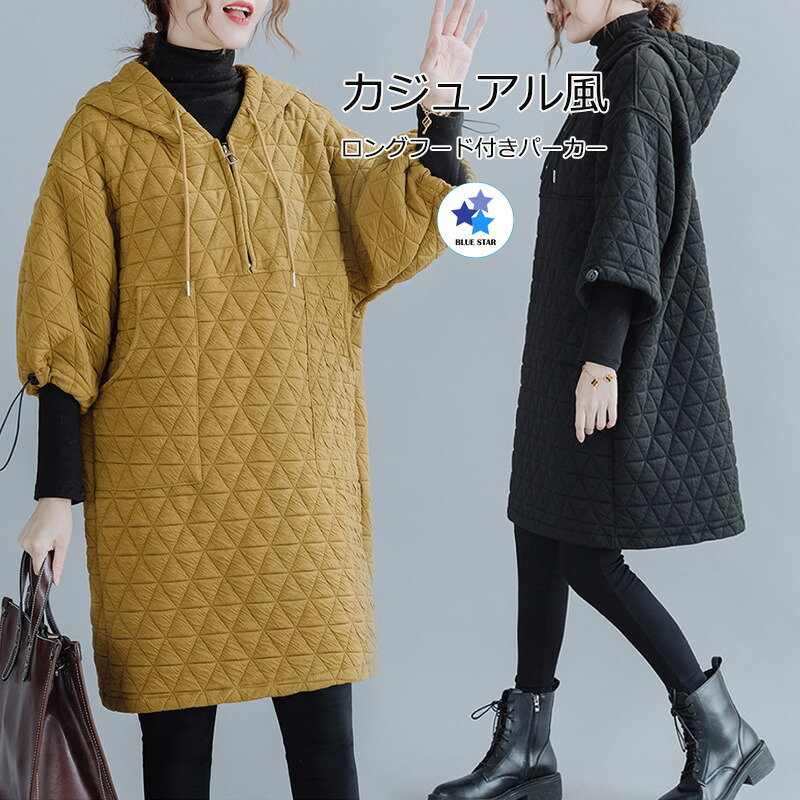 パーカー ワンピース レディース ロング チュニック パーカーワンピース 無地 フード付き 秋冬 キルティング ロングパーカー 大きいサイズ ゆったり 体型カバー ロング丈 トップス チ プルオーバー