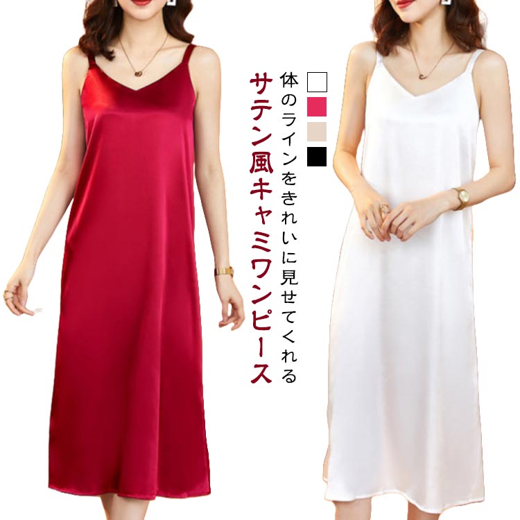 ワンピース レディース キャミソールワンピース ノースリーブ ロング丈 インナーワンピース ロングワンピ フェミニン きれいめ 高級感 光沢感 春 夏 無地 シンプル インナー 肌着 大きい サテン風
