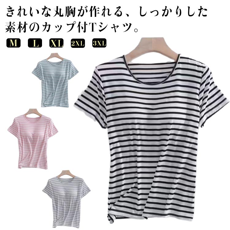 カップ付き 半袖 Tシャツ 夏 夏用 ボーダー レディース tシャツ インナー トップス きれいめ 部屋着 肌着 パッド付き ルームウェア パジャマ カップ一体型 ストライプ カジュアル ナイトウェア