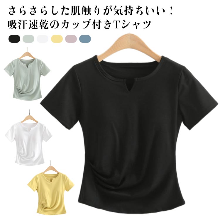 カップ付きTシャツ 半袖Tシャツ ブラ付き トップス Tシャツ レディース ショート丈 ヨガTシャツ 夏 薄手 半袖 ヨガトップス ストレッチ ショート シンプル 美ライン 無地 細見え ス きれいめ