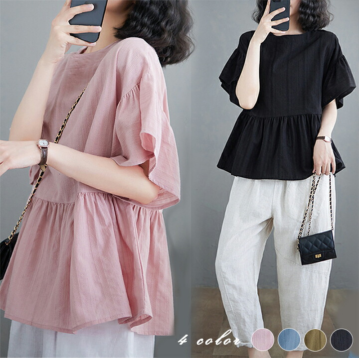ペプラムトップス ペプラムカットソー トップス レディース ブラウス半袖トップス半袖Tシャツ ゆったり Aライン きれいめ 大人 体型カバー 上品