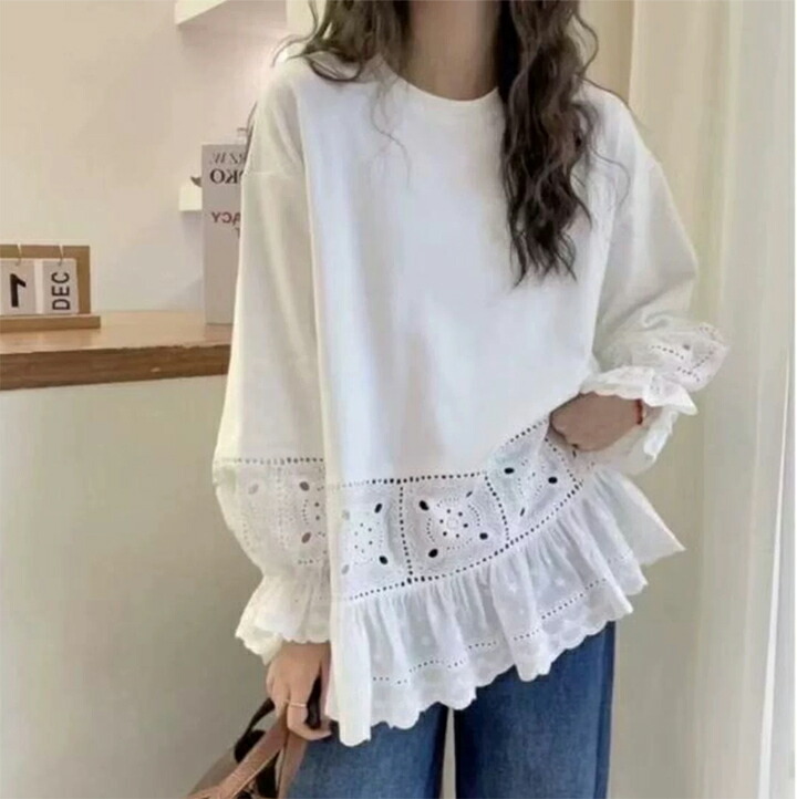 裾フリル ボリューム袖 トップス レディース 春 夏 大人可愛い レイヤード 無地 韓国ファッション エレガント長袖Tシャツ