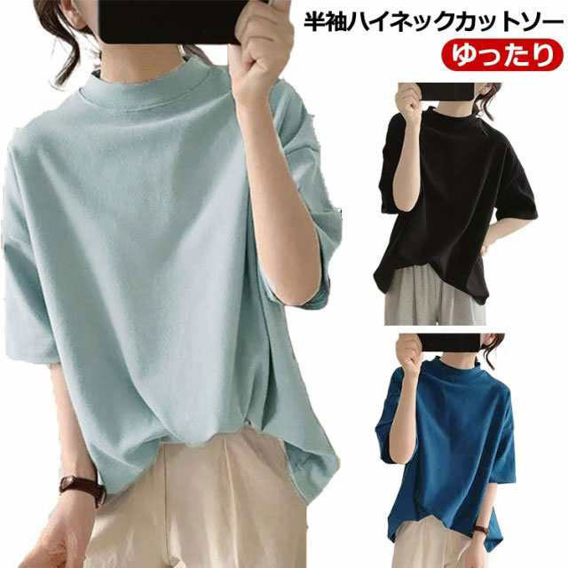 ハイネック カットソー Tシャツ 綿 プチハイネック 半袖 体型カバー tシャツ 夏 ドロップショルダー トップス レディース 女性 モックネック ゆったり 5分袖 大きいサイズ 無地 シンプ 着瘦せ
