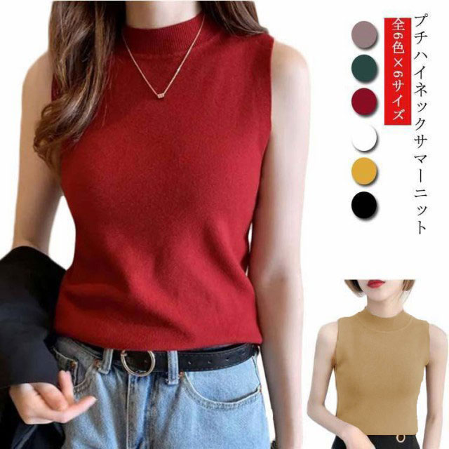 サマーニット レディース ノースリーブ カットソー トップス シャツ レディース 春 夏 秋 プチハイネック ハイネック