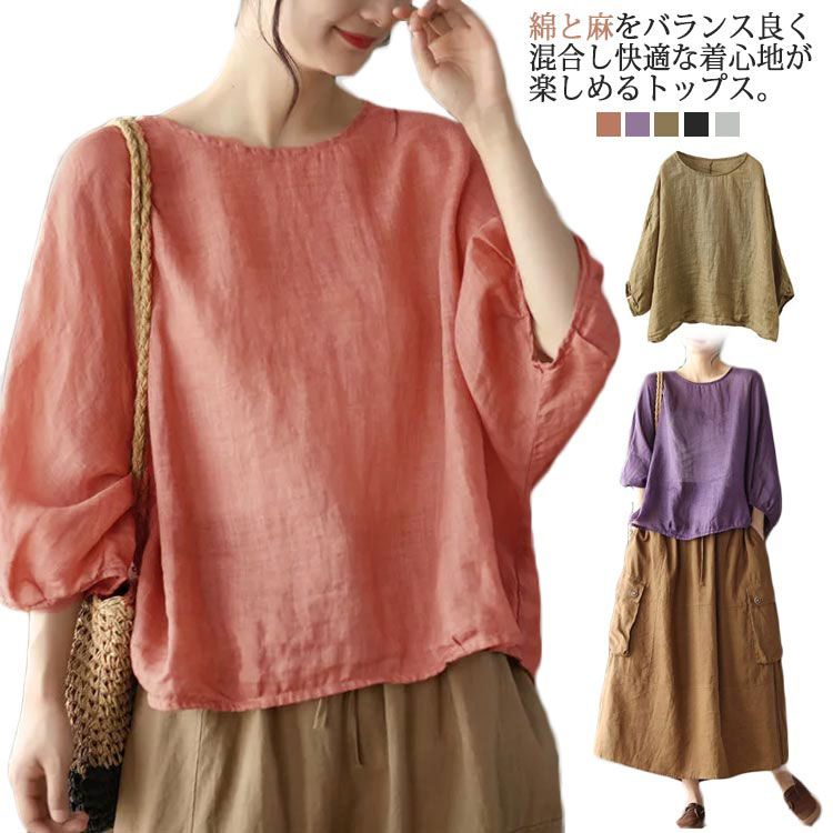ゆったり リネン 7分袖 綿麻混風 春 九分袖 プルオーバー 薄手 ブラウス レディース ドルマンスリーブ 夏 秋 おしゃれ 七分袖 長袖 無地 カジュアル 30代 T 大きいサイズ