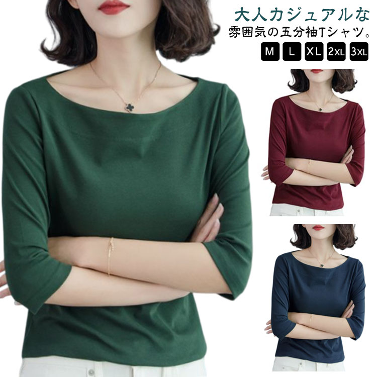 Tシャツ 5分袖 インナー カットソー レディース 2XL 無地 ボートネック 重ね着 着瘦せ シンプル カジュアル 大きいサイズ 春 夏 L XL 5分袖tシャツ M