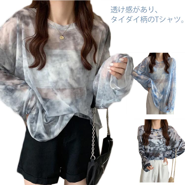 Tシャツ レディース 透け感 シアー カットソー タイダイ柄 長袖 ロング tシャツ シースルー 透け 薄手 シアートップス 重ね着 レイヤード セクシー ゆったり オゃれ カジュ ドロップショルダー