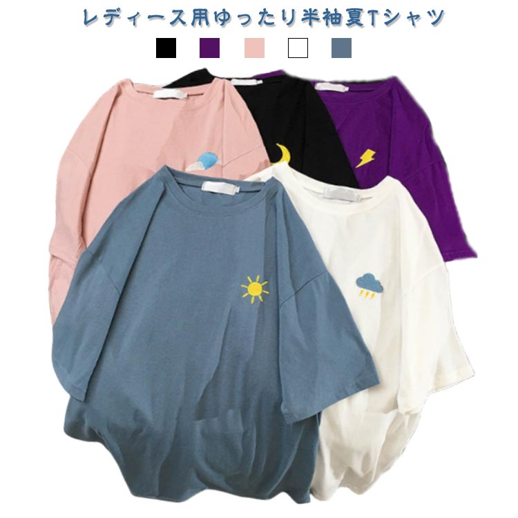 Tシャツ カジュアル クールネック 秋 半袖 夏 春 刺繍 レディース ゆったり 無地 大きいサイズ おしゃれ シンプル ゆるっと きれいめ 着回し カットソー tシャツ 半袖tシ トップス