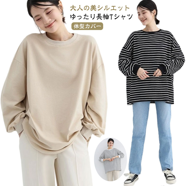 ゆったり長袖シャツ シャツ レディース カットソー 長袖 ボーダー 無地 ビッグシルエット ロング シャツ トップス スウェット トレーナー