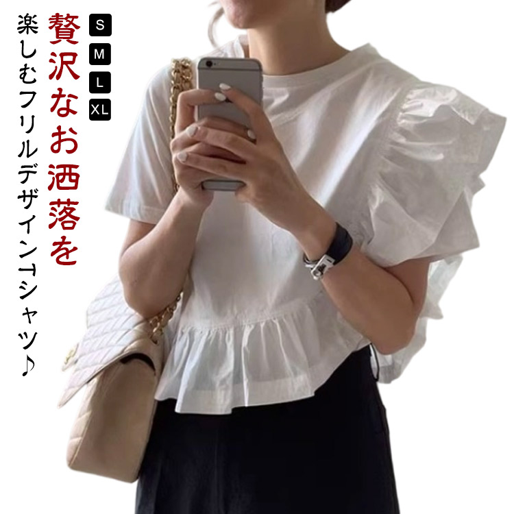 女性 シャツ アシンメトリー アシメ カットソー ホワイト フリル トップス 20代 大きいサイズ 白 黒 二の腕華見え 半袖 ブラック 30代 40代 50代 ラウンドネック
