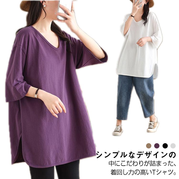 ゆったり 春夏 半袖Tシャツ 五分袖 レディース トップス ビッグシルエット 無地 オーバーサイズ チュニック Vネック 大きめ サイドスリット 長め丈 カジュアル 体型カバー カットソー シンプル