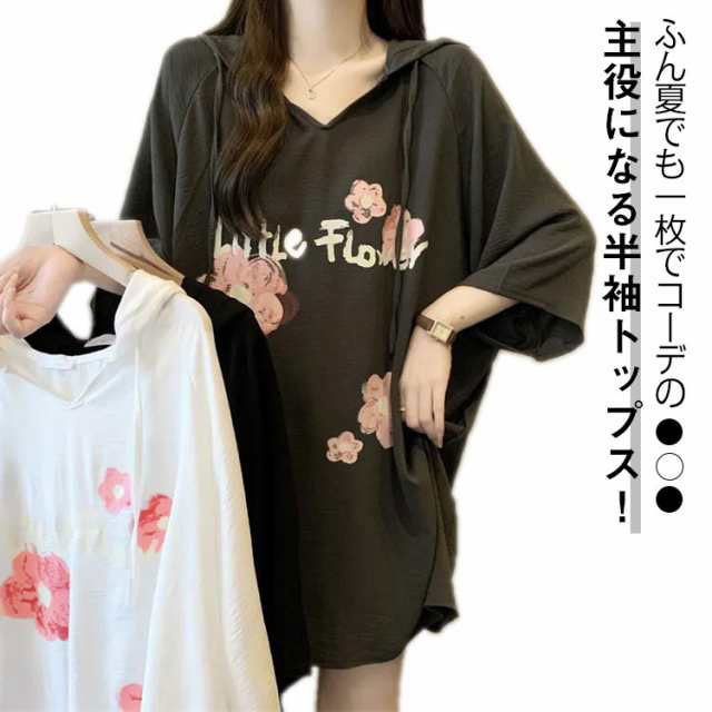 レディース プルオーバー チュニック プリント 夏tシャツ フード付き トップス 半袖Tシャツ ロングtシャツ ゆったり カットソー 体型カバー 大きいサイズ おしゃれ カジュアル