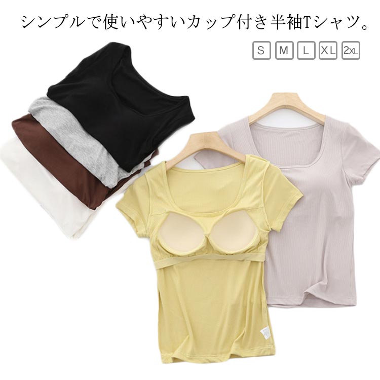 半袖Tシャツ カップ付き レディース カットソー 半袖インナー ルームウェア トップス 夏 下着 スクエアネック 肌着 大きいサイズ おしゃれ 部屋着 ジム 締め付けない