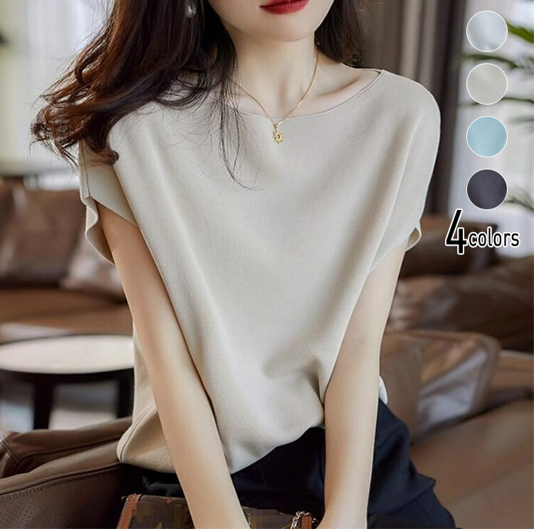 トップス サマーニット カットソー レディース フレンチスリーブ 半袖 ニットソー フレンチスリーブ プルオーバー 体型カバー 無地 接触冷感 ゆったり 薄手