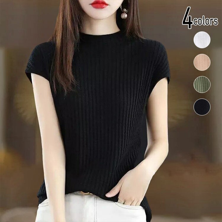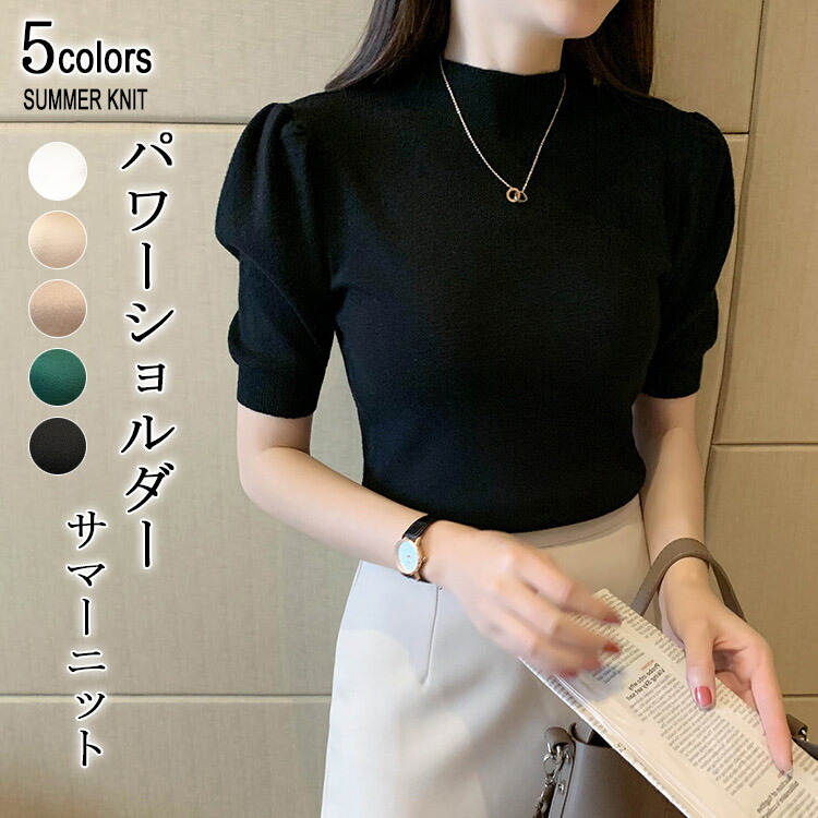 リブニット パワーショルダー5分袖 秋 さらっとした肌ざわり サマーニット ハーフタートルネック 半袖リブニット トップス オフィスカジュアル スタンドネック ニット カットソー 無地 大人 Tシャツ