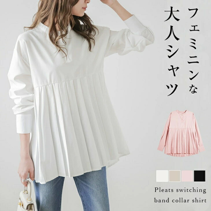 シャツ バンドカラーシャツ プリーツスウィッチング トップス レディース Aライン 可愛い ゆったり シンプル 大人 ピンク 春 新作 白
