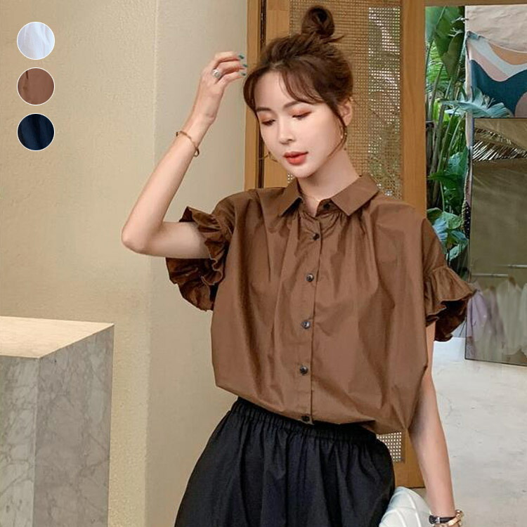 フリル袖 ブラウス レディース 半袖 無地 トップス ホワイト フレア袖 きれいめ カットソー ゆったり オシャレ 大人 可愛い お洒落 着回し抜群 カジュアル 体型カバー 春 秋 夏