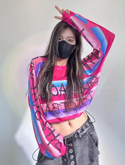 カラフルロゴ長袖トップスカットソー トレーナーへそ出し短め短いゆったりダンス衣装ヒップホップレディースガールズストリート奇抜派手韓国発表会文化祭イベント個性的
