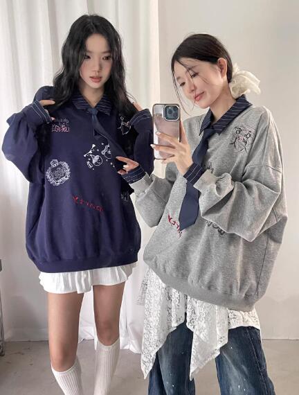 重ね着風ネクタイ刺繍長袖トップスカットソートレーナーグレーネイビー長めダンス衣装ヒップホップレディースガールズストリート韓国おしゃれ奇抜派手大人個性的かわいい
