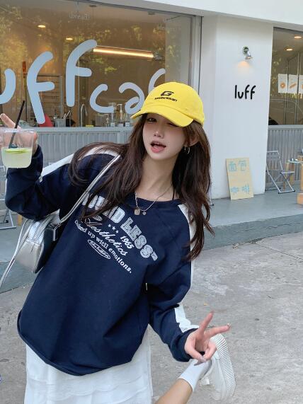 ユニフォーム風ロゴ バイカラー長袖トップスカットソートレーナーグレーネイビー長めダンス衣装ヒップホップHIPHOPレディースメンズガールズストリート韓国おしゃれ奇抜派手大人個性的