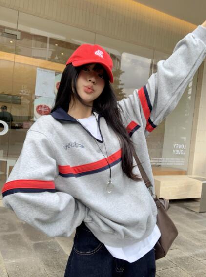 ユニフォーム風ロゴ ポロ長袖トップスカットソートレーナーグレーレッド長めダンス衣装ヒップホップHIPHOPレディースメンズガールズストリート韓国おしゃれ奇抜派手大人個性的