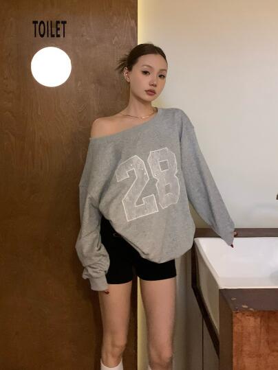 長袖 肩出しトップスカットソートレーナーナンバーグレー無地長め大きいサイズゆったりシンプルダンス衣装ヒップホップレディースガールズストリート韓国おしゃれ奇抜派手大人セクシー