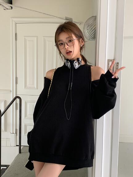 長袖 肩出しトップスカットソートレーナーブラック黒グレー無地長め大きいサイズゆったりシンプルダンス衣装ヒップホップレディースガールズストリート韓国おしゃれ奇抜派手大人セクシー