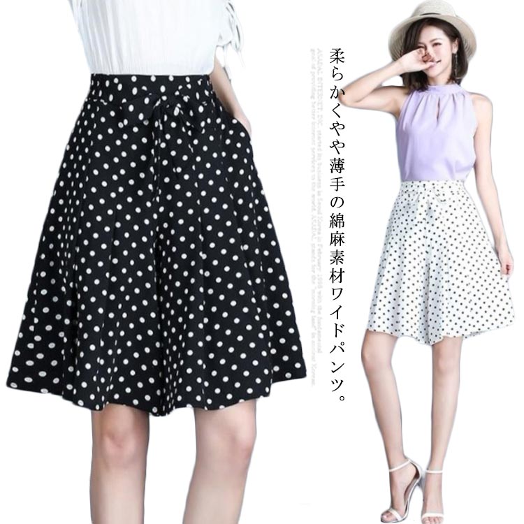 ドット柄ワイドパンツ ガウチョパンツ 五分丈 ワイドパンツ ドット柄 水玉柄 ハーフパンツ ワイドシルエット フレアパンツ スカート風 ウエストゴム 体型カバー 春夏 ボトムス お洒落 かわいい 夏