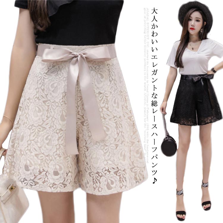 総レース ハーフパンツ ワイドパンツ レディース ガウチョパンツ フレアパンツ ショートパンツ レース パンツ ウエストゴム リボン キレイ目 おしゃれ カジュアル 裏地付き 美脚 夏 韓国フ 着痩せ