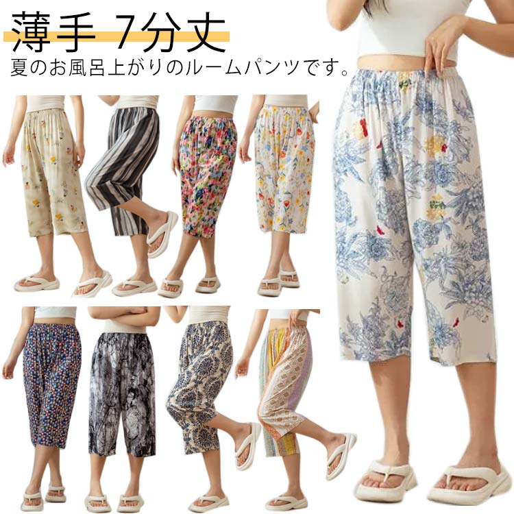 総柄 パジャマ ボトムス ナイトウェア リラックスパンツ 伸縮性 薄手 7分丈 ステテコ レディース ワイドパンツ カジュアル 春夏 ウェストゴム サラサラ ゆったり 肌に優しい ルームパン 夏パンツ