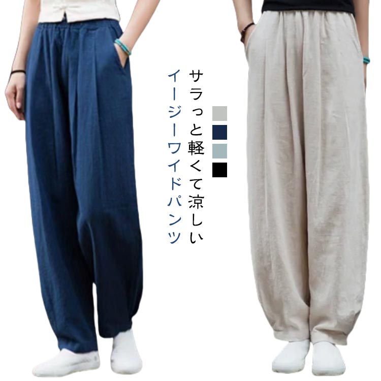 綿麻ワイドパンツ ロングパンツ 麻 麻混 ボトムス パンツ カジュアル レディース