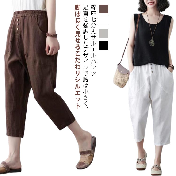 綿麻 ポケット サルエルパンツ ボトムス 7分丈 リネン 夏 レディース M-4XL 涼しい ウエスト きれいめ 無地 綿麻パンツ 春夏 美脚 おしゃれ リラックス パンツ ウエストゴ 着やせ