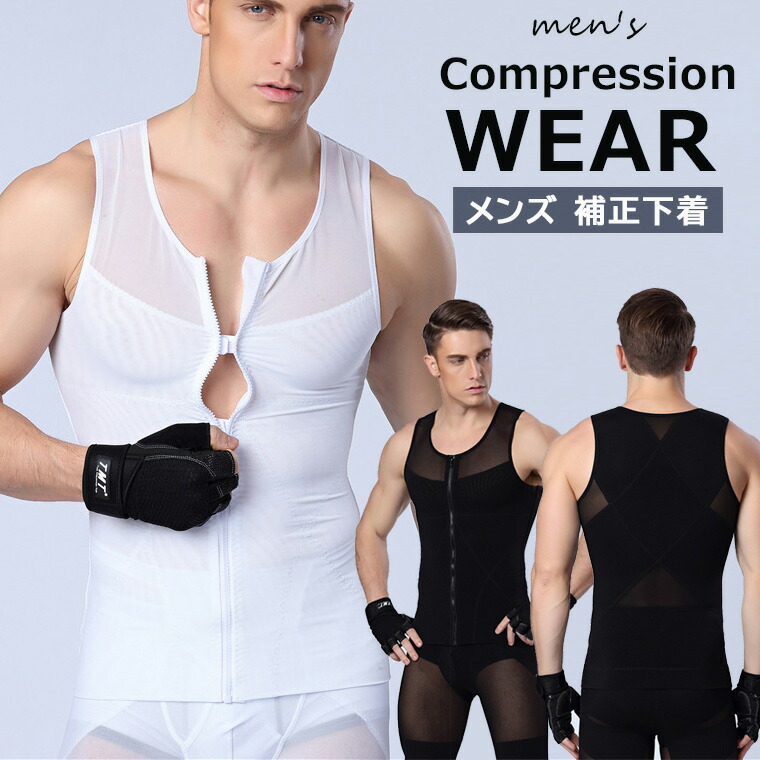 メンズ 補正下着 ぽっこりお腹を引き締めてくれる ノースリーブ タンクトップ 前開きジッパータイプ 2色 加圧インナー