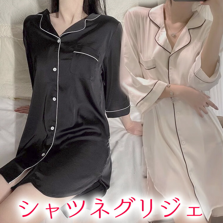 大人セクシーであざと可愛い ミニ丈 シャツワンピース ネグリジェ あざとかわいい あざとい ルームワンピース シャツワンピ 可愛い 七分袖 半袖 パジャマ 寝巻き ナイトウェア 彼氏 ボーイフ サテン
