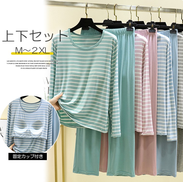 固定されているカップでズレる心配なし 5色展開 カップ付き 長袖カットソー+ロングパンツ 2点セット 上下セット 大きいサイズ 伸縮性 ボーダー レディース Tシャツ ルームウェア